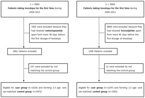 This study was conducted using two antiemetics: metoclopramide and levosulpiride. For cohorts, we identified patients aged ≥65 years, between 2009 and 2013, who obtained new prescriptions for levodopa through the NHIS during this period. We extracted the control group and the case group by the method shown in Figure 1.