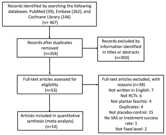 - Yin, M.C.; Ye, J.; Yao, M.; Cui, X.J.; Xia, Y.; Shen, Q.X.; Tong, Z.Y.; Wu, X.Q.; Ma, J.M.; Mo, W. Is extracorporeal shock wave therapy clinical efficacy for relief of chronic, recalcitrant plantar fasciitis? A systematic review and meta-analysis of randomized placebo or active-treatment controlled trials. Arch. Phys. Med. Rehabil. 2014, 95, 1585–1593. [Google Scholar] [CrossRef] [PubMed]