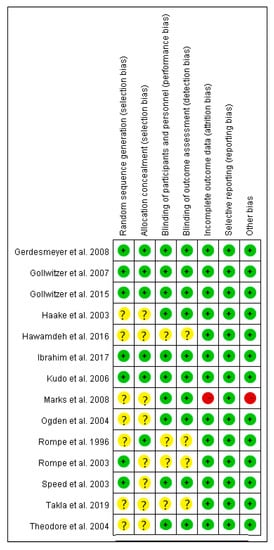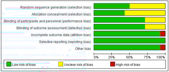 - Higgins, J.P.; Altman, D.G.; Gotzsche, P.C.; Juni, P.; Moher, D.; Oxman, A.D.; Savovic, J.; Schulz, K.F.; Weeks, L.; Sterne, J.A. The Cochrane Collaboration’s tool for assessing risk of bias in randomised trials. BMJ 2011, 343, d5928. [Google Scholar] [CrossRef] [PubMed]