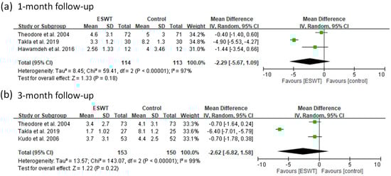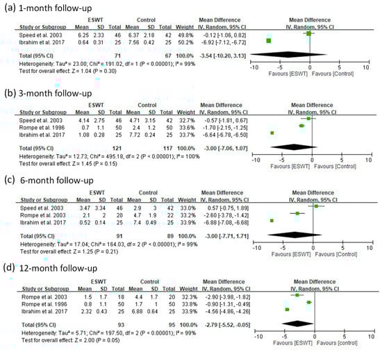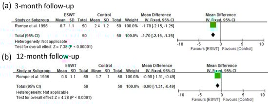| 2 | Rompe et al. 2003 | SB, RCT | FSW (medium) | No | 22 | 43.0 | 0.16 | 6 and 12 months | Success rate and VAS | >50% improvement of pain during the first few minutes of walking scored on VAS |