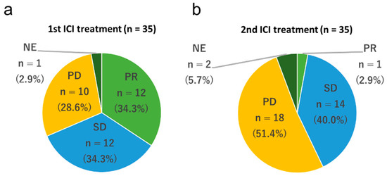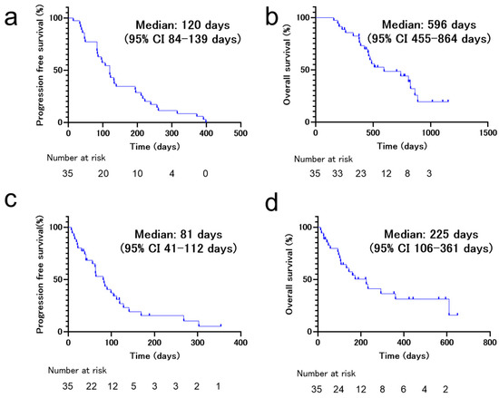 The initial ICI treatment consisted of nivolumab for 19 (54.3%) patients, pembrolizumab for 12 (34.3%) patients, and atezolizumab for four (11.4%) patients. The rechallenge treatment consisted of nivolumab for five (14.3%) patients, pembrolizumab for 7 (20.0%) patients, and atezolizumab for 23 (65.7%) patients. The patients were treated with different regimens of ICIs between the initial and rechallenge treatments. In the initial ICI treatment, no patients experienced a complete response (0%), 12 experienced a partial response (34.3%), 12 experienced stable disease (34.3%), 10 experienced progressive disease (28.6%), and one was non-evaluable (2.9%). The objective response rate was 34.3%, and the disease control rate was 68.6% (Figure 1a). The PFS and OS of the initial ICI treatments were 120 d (95% CI 84–139 d) and 596 d (95% CI 455–864 d), respectively (Figure 2a,b). In the ICI rechallenge treatment, no patients experienced a complete response (0%), one experienced a partial response (2.9%), 14 experienced stable disease (40.0%), 18 experienced progressive disease (51.4%), and two were non-evaluable (5.7%). The objective response rate was 2.9% and the disease control rate was 45.7% (Figure 1b). The PFS and OS of the ICI rechallenge were 81 d (95% CI 41–112 d) and 225 d (95% CI 106–361 d), respectively (Figure 2c,d).