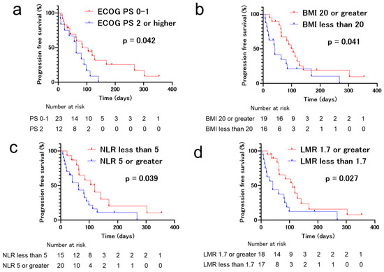 Kaplan–Meier survival curves for progression-free survival (PFS) of patients who received immune checkpoint inhibitor (ICI) rechallenge treatment. (a) Eastern Cooperative Oncology Group (ECOG-PS) ≥ 2, (b) body mass index (BMI) ≤ 20, (c) neutrophil-to-lymphocyte ratio (NLR) > 5, and (d) lymphocyte-to-monocyte ratio (LMR) ≤ 1.7 were significantly associated with inferior PFS.