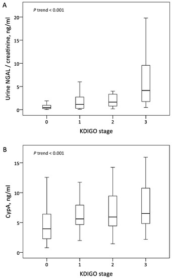 Levels of urine NGAL normalized by urine creatinine (A) and serum CypA (B) across KDIGO stages. Abbreviations: CypA, cyclophilin A; NGAL, neutrophil gelatinase-associated lipocalin; KDIGO, Kidney Disease Improving Global Outcomes.
