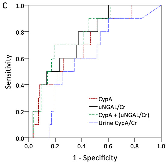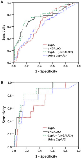 In summary, both serum CypA and normalized uNGAL are suitable for the early detection of AKI in patients undergoing cardiac surgery, as both have acceptable discriminative power. Moreover, the combination of these two markers provides the highest AUROC and could serve as a new non-invasive test for use in clinical applications to differentiate AKI and RRT, potentially shortening the time to the initiation of appropriate therapy. Relatedly, the careful consideration of the appropriate medication, choice of therapy, and early intervention in patients exhibiting increased biomarker levels may improve AKI outcomes.