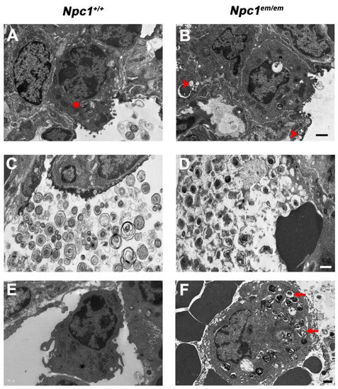 Lung surfactant covers the surface of alveoli, acting to reduce surface tension at the air–lung interface to allow essential gas exchange [40]. Lung surfactant also plays a major role in neonatal survival [41,42]; therefore, lung tissues from Npc1em/em newborn pups were analyzed using transmission electron microscopy (TEM). This analysis showed that Npc1em/em newborn mutants contained an abnormal accumulation of lipid droplets throughout the lung tissue (Figure 2A,B). TEM analysis also revealed abnormally structured surfactant-like particles along with amorphous extracellular material accumulated in the air space of Npc1em/em mutants, which was notably different from the “onion ring” structure of normal surfactant particles present in Npc1+/+ mice (Figure 2C,D). Furthermore, Npc1em/em mutants exhibited enlarged alveolar macrophages containing vacuole-like particles as a result of lipid accumulation (Figure 2E,F). Additionally, lipidosis was detected prior to birth in E16.5 Npc1em/em mutants (Figure S2), consistent with these lung abnormalities arising during embryonic development. These results indicate that Npc1em/em newborn mutants displayed labored breathing at birth accompanied by abnormal lipidosis and surfactant accumulation in the lung’s alveolar space, suggesting that neonatal lethality in Npc1em/em mutants is associated with respiratory insufficiency.