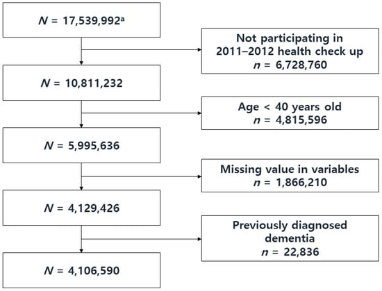 The initial population was NHSP participants (Korean population aged 40 and above, and all employees regardless of age) in 2009–2010 (n = 17,539,992). Those who did not participate in subsequent 2011–2012 NHSP (n = 6,728,760), and those younger than 40 years old at baseline (n = 4,815,596) were excluded. Participants with a history of all-cause dementia (International Classification of Disease, 10th Revision (ICD-10) codes: F00, F01, F02, F03, G23.1, G30, G31) before the index date, which was the second NHSP examination day in 2011–2012 (n = 22,836) were excluded. Participants with any missing variable values (e.g., past medical history or lifestyle questionnaire, n = 1,866,210) were also excluded. Finally, 4,106,590 participants were included in analyses (Figure 1). This study was approved by the Institutional Review Board of Samsung Medical Center (IRB File No. SMC 2019-01-026).