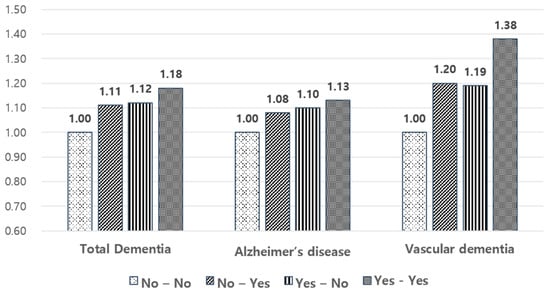 In this study, MS increased the risk of both AD and VD. MS was more strongly associated with VD (aHR 1.27, 95% CI 1.22–1.32) than AD (aHR 1.09, 95% CI, 1.07–1.11). This result was consistent with previous studies [,], in which VD was more strongly associated with MS than AD. The causes of VD include small strokes, large infarctions, and small vessel disease, all of which are affected by cardiovascular risk factors. The importance of vascular components in the development of cognitive decline and dementia has been widely recognized, so cognitive disorders associated with cerebrovascular disease are called vascular cognitive impairment (VCI), with VD the most severe form []. This study result supports the recent concept of VCI.
