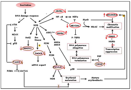Similar functional annotation of differentially expressed proteins in treated and un-treated thalassemic cultures indicated that in these cultures decitabine promoted survival of immature erythroid progenitors, possibly due to modulation of erythropoiesis. This is supported by the down-regulation of proteins involved in erythroid maturation such as PICALM, a clathrin assembly lymphoid myeloid leukemia protein involved in erythroid maturation and transferrin internalization in mice [41], ABCB6, a glycoprotein expressed in the membrane of mature erythrocytes and in exosomes released from reticulocytes at the final steps of erythroid maturation [47] and up-regulation of TACC3, a protein highly expressed in hematopoietic progenitors [48]. Moreover, results suggest that decitabine affects transcriptional activation of genes downstream of oxidative stress pathways such as HMOX1, a target gene of the central regulator of cellular oxidative stress response Nrf2 [49] and up-regulation of THOC5, a key protein in the maintenance of hematopoietic stem cells which is phosphorylated in the presence of oxidative stress [50] and PPP5C, a negative regulator of hypoxia-induced activation of apoptosis signal-regulating kinase 1 [51] Proteins such as RBM10, an RNA binding regulator of splicing [52] and XRN2, a 5’-3’ exonuclease that promotes transcriptional termination [53,54] were upregulated, while HEXIM, a regulator of transcriptional elongation of RNA polymerase II [39] was downregulated. These findings suggest that decitabine promotes transcriptional termination and post-transcriptional processes. Decitabine also appears to regulate chromatin remodeling as can be observed by the up-regulation of SMARCD3, a subunit of SWI/SNF complex that promotes DNA-histone dissociation [55] and the downregulation of CHD5, a chromatin remodeling, helicase and DNA-binding protein which is activated by demethylation of its promoter [56]. A hypothetical pathway of the effects of decitabine treatment of thalassemic cultures is shown in Figure 2.