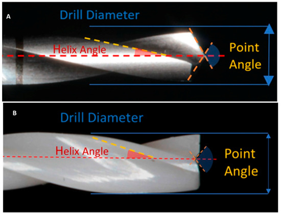 (A) Steel cylindrical 2 mm diameter drill with negative point angle ~110°, helix angle ~25°. (B) Zirconia cylindrical 2 mm diameter drill with positive point angle ~120°, helix angle ~20°.