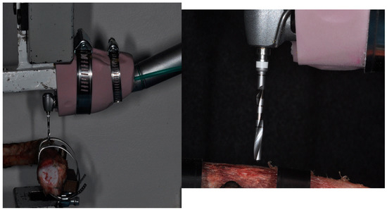 All drilling was prepared to 10 mm depth at a speed of 800 rev/min under abundant external irrigation with saline solution. The rotational speed of 800 rpm was used for easy comparison with previous work [27]. A 20:1 implant handpiece with a physio-dispenser (Vario-Surgery NSK, Tochigi, Japan) was mounted on a universal testing machine, so that there was a constant drill load (Figure 3). Continuous drilling was performed with a Lloyd 30K universal testing machine (Lloyd Instruments Ltd., Segensworth, UK), with constant load applied during implant site preparation, which was 2 kg during the entire implant preparation, and a constant torque of 40 N/cm. Moreover, the drilling depth parameter of 10 mm was electronically set for both drill groups using the Lloyd 30K universal testing machine to ensure the reliability and repeatability of the experiment. During implant preparation, the bone rib was always in a thermostat-controlled saline bath leaving 3 mm of bone emerged out of solution. The drills were not sterilized or disinfected, only cleaned. The time taken to perform the osteotomy was recorded and expressed in seconds.