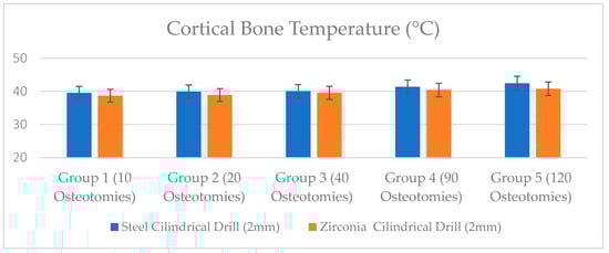 No statistical difference was detected in the group 1 (p = 0.54). The zirconia groups showed statistically lower bone temperature compared to steel drills in Group 2, Group 3, and Group 4. After 120 osteotomies, the steel group showed a bone temperature of 42.45 ± 1.70 °C, compared to the zirconia drills which reported average values of 40.80 ± 0.85 °C (Table 1, Figure 6).