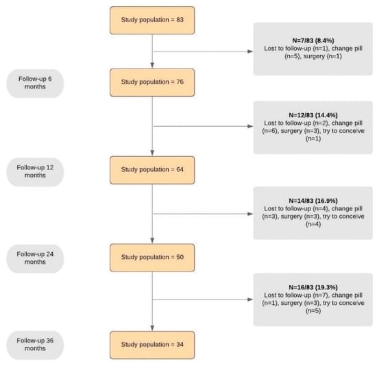 At the 36-month follow-up, 34 women (41.0%) were still using DNG. With the exclusion of patients lost to follow-up, discontinuation because of adverse events was the most common cause of withdrawing (37.1%, 13/35). Discontinuation because of adverse effects was more frequent in the first year of therapy (47.3%, 9/19) in comparison to the second year (14.3%, 2/14, P = 0.046) and third year of therapy (12.5%. 2/16; P = 0.035). After treatment discontinuation, the patients most commonly opted to change the hormonal regimen (15/35; 9/15 because of adverse events; 4/15 for unchanged or worsened disease symptoms; 2/15 because of desire of contraception) or to undergo surgery (10/35; 6/10 because of adverse events; 4/10 because of unchanged or worsened disease symptoms).