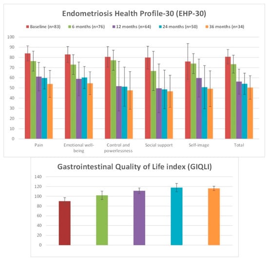 Representation of changes in Endometriosis Health Profile-30 (EHP-30) and Gastrointestinal Quality of Life Index (GIQLI) scores during the treatment.