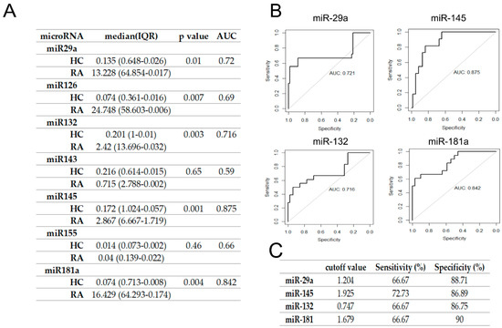 Serum miR- 29a, miR-145, miR-132, and miR-181a differentiated RA from HC. (A) Serum expression of seven miRNAs for a candidate RA biomarker. The area under curve (AUC) was calculated after plotting the receiver operating characteristic (ROC) curve. (B) ROC curve analyses of miR-29a, miR-145, miR-132, and miR-181a, which showed the highest values for AUC. (C) The sensitivity and specificity test for RA of miRNAs with the highest AUC value. The cutoff value was selected using a method that maximizes sensitivity and specificity simultaneously. IQR, Interquartile range; RA, rheumatoid arthritis; HC, healthy control.