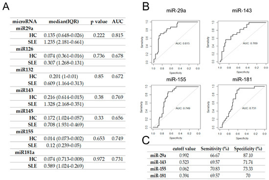 ROC curve analysis and calculated AUC values of seven miRNAs for the candidate SLE biomarker. (A) Serum expression of seven miRNAs for candidate SLE biomarker. The AUC was calculated after plotting the ROC curve. (B) ROC curve analyses of miR- 29a, miR-143, miR-155, and miR-181a, which showed the highest values for AUC. (C) The sensitivity and specificity test for SLE of miRNAs with the highest AUC value. Cutoff value was selected using a method that maximizes sensitivity and specificity simultaneously. SLE, systemic lupus erythematosus.