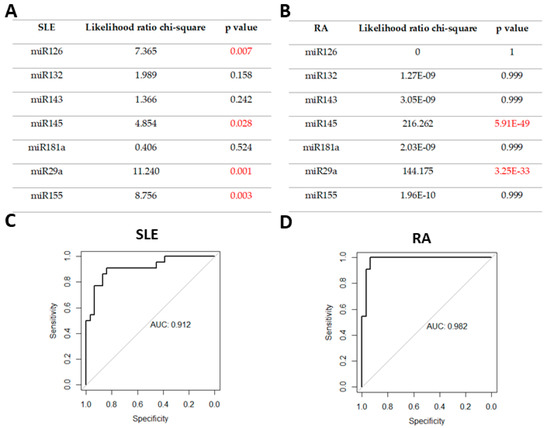 In the next step, we analyzed a combination of selected microRNAs in order to evaluate whether they increase the diagnostic accuracy of the potential biomarker. We conducted multivariable logistic regression analysis including all of the miRNAs studied. Crucial factors in multivariate logistic regression model for RA and SLE differentiation have been analyzed using the likelihood ratio test. The combination of four microRNAs (miR-145, miR-155, miR-29a, and miR126) in SLE and combination of the two microRNAs miR-145 and miR-29a in RA turned out to be significant to that model (Figure 3A,B)