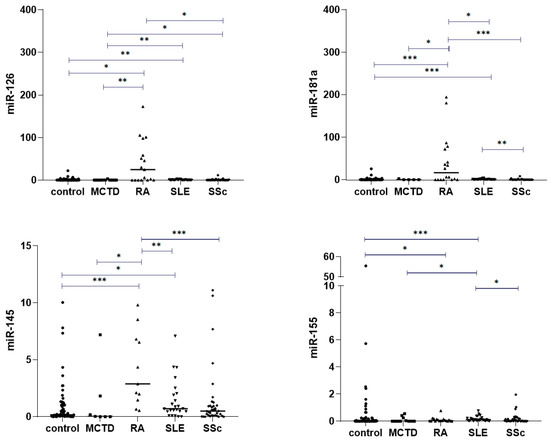 The present study has demonstrated the expression profile of six microRNAs: miR-155, -143, -126, -29a, -181a, and -132 in serum from patients with MCTD (n = 15), SLE (n = 24), SSc (n = 37), and RA (n = 18), as well as in healthy subjects (n = 75). In patients with RA and SLE, all examined miRNAs were upregulated in comparison to controls. The levels of miR-155 (p = 0.03), -126 (p = 0.01), -29a (p = 0.004), -181a (p < 0.0001), -145 (p < 0.0001) and -132 (p = 0.007) were significantly higher in the sera of RA patients than in healthy subjects. Levels of miR-155 (p < 0.0002), -126 (p = 0.009), -29a (p < 0.0001), -143 (p = 0.003), -181a (p = 0.0009), -132 (p = 0.02), and -145 (p = 0.03), were significantly higher in the serum of SLE patients compared to in the control group (Table 2). SSc and MCTD microRNAs expression profiles did not differ significantly from healthy controls (Table 2).
