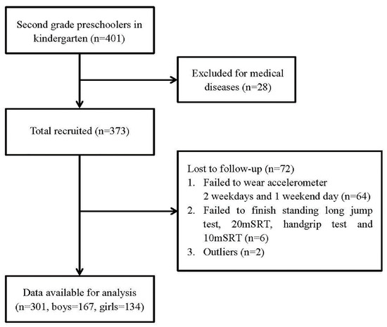 A total of 301 participants from 401 preschoolers were included in our study. Of them, 100 participants were excluded in final data analysis due to the following reasons: (1) unable to participate in fitness test (n = 28); (2) valid accelerometer wear days did not yield at least 2 weekdays and 1 weekend day (n = 64); (3) failed to complete SLJ, grip strength, 20mSRT, or 10 mSRT test (n = 6); and (4) outliers (n = 2). Collectively, 301 children (167 boys and 134 girls, mean age 57.8 ± 5.4 months) were included in the statistical analysis (See Figure 1).