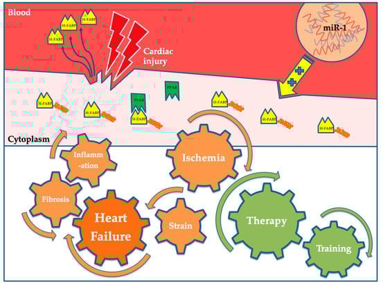 Under physiological conditions, H-FABP serves as a transport protein in cellular metabolism and can reversibly bind fatty acids. Furthermore, it can activate PPARs and therefore plays a role in lipid metabolism and energy homeostasis. The expression of H-FABP is regulated by the microRNA miR-1. In response to cardiac injury, H-FABP is rapidly released into the blood-stream where it can be quantified. Physical training as well as pharmacological interventions like anti-tachycardic therapy were shown to decrease plasma levels of H-FABP. Abbreviations: miR-1: microRNA 1; PPAR: peroxisome proliferator activated receptor (PPAR). H-FABP: heart-type fatty acid-binding protein.