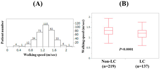 (A) Patient number distribution according to walking speed (WS). (B) The WS value according to the LC status.