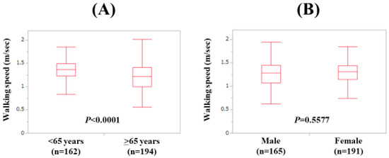 Baseline features of the analyzed subjects (n = 356) are presented in Table 1. The study cohort included 165 males and 191 females with the median age (range) of 66 (25–94) years. In terms of the disease etiology for CLD, hepatitis C virus was in the majority (181/356, 50.8%). The median (range) WS was 1.3 m/s (0.2–2.02 m/s). Number distribution for the WS value is demonstrated in Figure 1A. The number of patients with 1.2 m/s < WS < 1.4 m/s was the highest (110 cases, 30.9%). LC was identified at baseline in 137 cases (38.5%). There were 17 patients with WS < 0.8 m/s (4.8%) and 51 patients with WS < 1.0 m/s (14.3%). In males, the median (range) HGS was 33.6 kg (13.6–53.6 kg), while in females, the median (range) HGS was 20.5 kg (6.0–34.8 kg). Twenty-eight males (17.0%) and 57 females (29.8%) had the HGS decrease (HGS: <26 kg or <18 kg). In males, the median (range) SMI was 7.475 kg/m2 (5.21–11.01 kg/m2), while in females, the median (range) SMI was 5.875 kg/m2 (3.90–8.17 kg/m2). The median (range) WS in LC patients (1.23 m/s (0.33–1.76 m/s) was significantly slower than that in non-LC patients (1.36 m/s (0.2–2.02 m/s); p < 0.0001; Figure 1B). The difference of WS between patients aged <65 years (n = 162) and those aged ≥65 years (n = 194) also reached significance (p < 0.0001; median (range): 1.365 m/s (0.33–1.85 m/s) vs. 1.22 m/s (0.20–2.02 m/s); Figure 2A) The difference of WS between male patients and female patients did not reach significance (p = 0.5577; median (range): 1.28 m/s (0.2–2.02 m/s) vs. 1.31 m/s (0.33–1.84 m/s); Figure 2B).