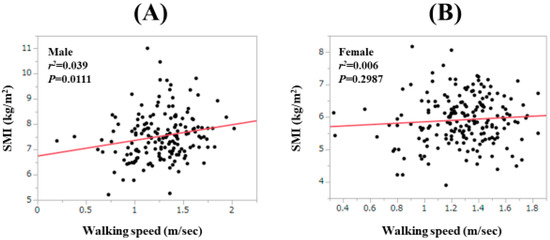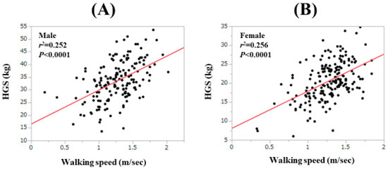 The WS value was significantly correlated with the HGS value both in males and females for all cases, LC patients and non-LC patients, in this study. However, there are some cases where there was a gap between the WS value and the HGS value, as shown in Figure 3A,B. The improvement in WS requires quick movement, whereas the improvement in the HGS does not require it and this may account for our current results. Both maintained cognitive function and muscle strength may be necessary for the improvement of WS, while even if cognitive function is reduced, the HGS value will not decrease as long as muscle strength is maintained [20,34]. While the correlation coefficient between the WS value and SMI was not impressive compared with that between the WS value and the HGS value, muscle function and muscle mass may play different roles for the development of sarcopenia [19,30].