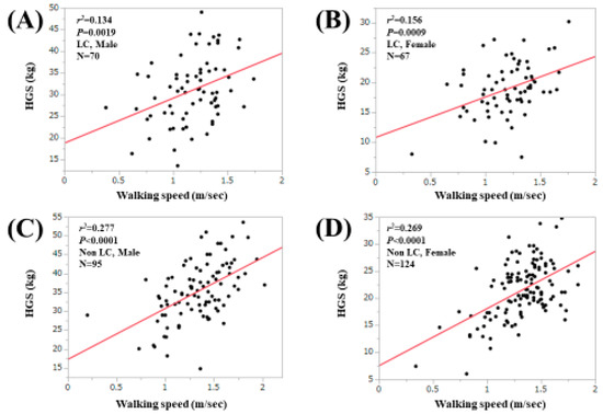 For all cases, the WS value was significantly correlated with the HGS value both in males (r2 = 0.252, p < 0.0001) and females (r2 = 0.256, p < 0.0001; Figure 3A,B). For LC cases, the correlation between the WS value and the HGS value reached significance in both males (r2 = 0.134, p = 0.0019) and females (r2 = 0.156, p = 0.0009; Figure 4A,B). For non-LC cases, the correlation between the WS value and the HGS value reached significance in both males (r2 = 0.277, p < 0.0001) and females (r2 = 0.269, p = 0.0009; Figure 4C,D). In male patients, the proportion of patients with both HGS < 26 kg (cutoff value in the JSH guidelines) and WS < 0.8 m/s was 3.0% (5/165), while that with both HGS < 26 kg and WS < 1.0 m/s was 6.7% (11/165). In female patients, the proportion of patients with both HGS < 18 kg (cutoff value in the JSH guidelines) and WS < 0.8 m/s was 2.6% (5/191), while that with both HGS < 18 kg and WS < 1.0 m/s was 8.9% (17/191) [10].
