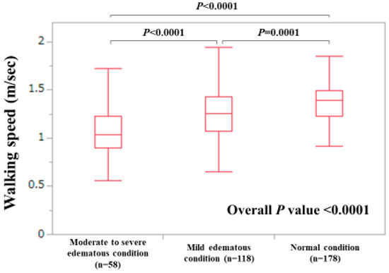 Based on the results of multivariate analyses, we further examined the impact of the ECW to TBW ratio on WS decline. Extracellular fluid excess was categorized as the following three types: normal condition (ECW to TBW ratio < 0.390, n = 178), mild overhydrated condition (ECW to TBW ratio 0.390–0.399, n = 118) and moderate to severe overhydrated condition (ECW to TBW ratio ≥ 0.400, n = 58) [29]. As shown in Figure 7, the WS value was well stratified according to the ECW to TBW ratio (p-values: normal vs. mild, p = 0.0001; mild vs. moderate to severe, p < 0.0001; normal vs. moderate to severe, p < 0.0001; overall p-value < 0.0001).