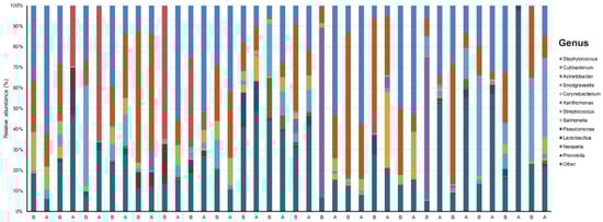 DNA was separated from the skin samples using an enzymatic lysis and bead-based tissue homogenization protocol; the samples were incubated shortly in a lytic enzyme mixture of lysozyme, mutanolysin, proteinase K, and lysostaphin, followed by mechanical lysis with silica beads (0.1 mm), as published beforehand [9]. The DNA cleanup was then conducted with a fecal DNA extraction kit (ZR Fecal DNA MiniPrep; Zymo Research). After DNA extraction, the V3–V4 hypervariable region of the 16S rRNA gene was amplified by polymerase chain reaction and sequenced using the Illumina HiSeq platform (250 base pairs, paired-end reads) as reported previously [10,11].