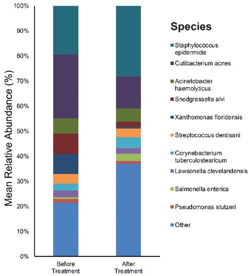 Our findings of significant changes in the relative abundance (%) of multiple bacterial species may also have important clinical implications. In addition to the reduction of C. acnes, we observed a 3.85-fold decrease in Snodgrassella alvi (S. alvi) after six weeks of doxycycline treatment. S. alvi, a species known as a gut symbiont of bees, has been identified as a core microbiota of Demodex mites from rosacea patients [20] and was also prevalent (8%) in our untreated skin samples. Interestingly, an association between Demodex infestation and acne has been reported in prior studies [21,22,23]. Although our findings suggest a subtle link between acne and Demodex infestation, there is some doubt on the origin of S. alvi. Since Demodex mites usually reside in the hair follicles and sebaceous glands, they would not have been thoroughly collected through skin swabbing.