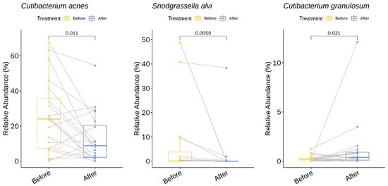 We identified two genera (with a relative abundance greater than 0.1% across all samples) and three species with statistically significant changes in relative abundance upon treatment with doxycycline (Table S3 and Figure 3). Among the three species, two showed a decrease in the mean relative abundance: C. acnes decreased 1.96-fold from baseline (pre-treatment) to week six (post-treatment) (p = 0.01, 95% CI −22% to −3%) and Snodgrassella alvi decreased 3.85-fold (p < 0.01, 95% CI −24% to −0.2%). In contrast, one species showed an increase in the relative abundance following treatment with doxycycline: Cutibacterium granulosum increased 4.46-fold (p = 0.02, 95% CI 0.04% to 0.9%).