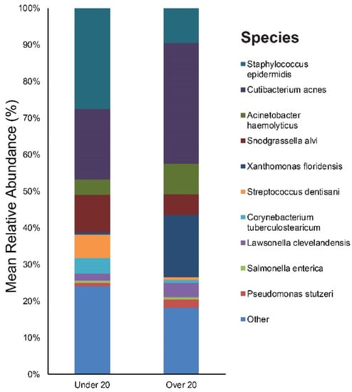 The study participants were divided into two age groups: The children/adolescent group (aged under 20 years, n = 11, mean age: 14), and the young adult group (aged over 20 years, n = 9, mean age: 26). Figure S2 provides the results of the main bacterial phyla, genus, and species in our under 20, and over 20 subjects, respectively. Staphylococcus (28%), Cutibacterium (20%), and Snodgrassella (10%) were the main bacterial genera found in the under 20 age group’s skin. The most dominant taxonomic groups at the species level in under 20 skin were: S. epidermidis (27%), followed by C. acnes (19%) and Snodgrassella alvi (10%) (Figure 4). In the over 20 age group, the predominant genera were as follows: Cutibacterium (33%), Xanthomonas (17%), and Staphylococcus (10%). Among the bacterial species, C. acnes (33%) was most commonly found in the skin samples followed by Xanthomonas floridensis (17%) and S. epidermidis (10%) (Figure 4).