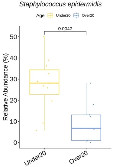 We identified three genera (with a relative abundance greater than 0.1% across all samples) and seven species with a statistically significant difference in the relative abundance between the two age groups (Table S4). All seven species showed a higher relative abundance in the under 20 age group: Staphylococcus epidermidis (Figure 5), Corynebacterium matruchotii, Corynebacterium durum, Corynebacterium tuberculostearicum, Streptococcus thermophilus, Streptococcus dentisani, and Corynebacterium timonense.