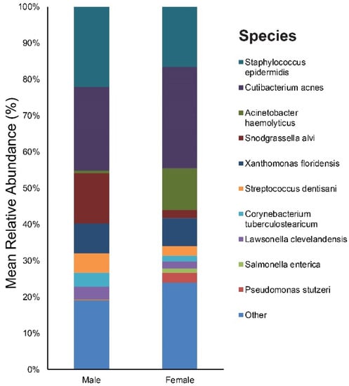 As for sex, our study included 10 males and 10 females. Figure S3 provides the results of the main bacterial phyla, genus, and species in male and female subjects, respectively. Cutibacterium (23%), Staphylococcus (22%), and Snodgrassella (14%) were the main bacterial genera found in males. The most dominant taxonomic groups at the species level in male skin were C. acnes (23%) followed by S. epidermidis (22%) and Snodgrassella alvi (14%) (Figure 6). In the female group, the predominant genera were as follows: Cutibacterium (28%), Staphylococcus (17%), and Acinetobacter (12%). Among the bacterial species, C. acnes (28%) was most commonly found in the skin samples followed by S. epidermidis (17%), Acinetobacter haemolyticus (12%), and Xanthomonas floridensis (8%) (Figure 6).