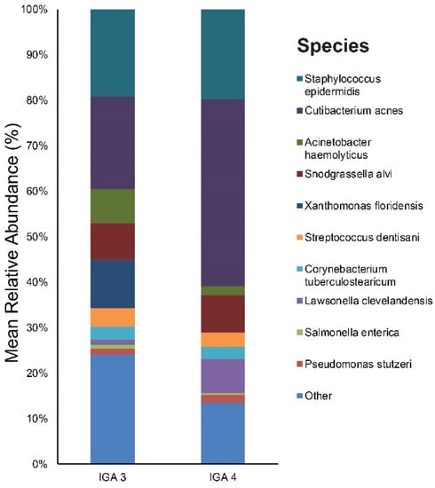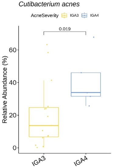 We identified two genera (with a relative abundance greater than 0.1% across all samples) and two species with a significant difference in the relative abundance between acne severity (IGA) 3 and the IGA 4 group (Table S6). The two species, Cutibacterium acnes (Figure 8) and Lawsonella clevelandensis, showed a higher relative abundance in the IGA 4 group.