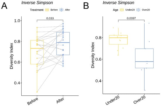 As for the α diversity between the under 20 and over 20 age group, the inverse Simpson was 1.29-fold (p = 0.01, 95% CI 0.06 to 0.3) higher in the under 20 subjects (Figure 9B).