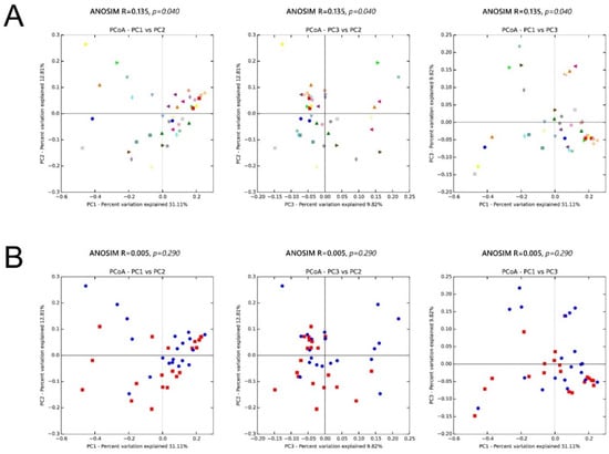 We also assessed the inter-sample diversity, or β diversity, based on principal coordinates analyses of weighted UniFrac distances. Similarity between samples across the three principal coordinates (PC1, PC2, and PC3) with samples that cluster close to one another indicates a similar bacterial composition between those samples. The ANOSIM (Analysis of Similarity), which generates an R test statistic stretching from −1 to 1, was used to measure the clustering of samples by patient and treatment (Figure 10). A positive R value indicates greater within-group similarity than between-group similarity, with greater magnitudes of the R value suggesting stronger clustering of samples. An R value of 0 indicates no clustering of samples, whereas a negative R value suggests greater between-group resemblance than within-group similarity. Although there was mild clustering of samples by patient (ANOSIM, R = 0.135; p = 0.04), showing the distinctive microbial signature for each person, clustering by treatment (ANOSIM, R = 0.005; p = 0.29) was much less apparent.