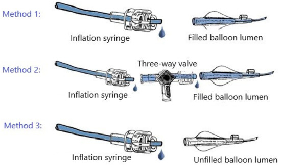Method 1 involved (1) purging and filling the balloon lumen with the inflation solution and connecting it to the inflation syringe and (2) aspirating three times for 10 s and then slowly releasing the negative pressure for 10 s. Method 2 involved (1) purging and filling the balloon lumen with the inflation solution; (2) connecting the inflation syringe and the balloon catheter via a three-way valve with the meniscus-to-meniscus method; (3) aspirating for 10 s and slowly releasing the negative pressure for 10 s; (4) removing air from the system through the three-way valve; and (5) again, aspirating and releasing the negative pressure for 10 s. Finally, method 3 involved (1) connecting the inflation syringe to the balloon catheter without purging and filling the balloon lumen and (2) aspirating three times for 10 s, then releasing the negative pressure for 10 s.