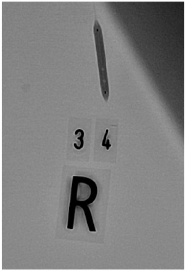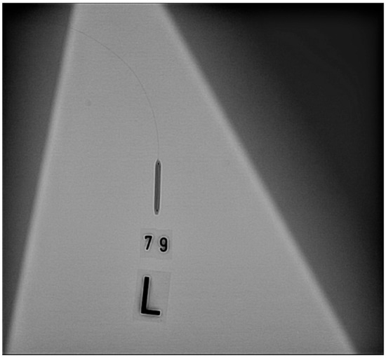 Before connections were established using any of these methods, we filled the inflation syringe with 20 mL of the inflation solution and removed air from it, as indicated in the instructions for use [6]. Afterwards, the balloons were inflated to their nominal pressure (trials 1 and 2) or to 1 atm below their rated burst pressure (RBP) (trials 3 and 4). The balloons were inflated at a rate of 2 atm per second. We tested each balloon four times with the same method. Between inflations, we disconnected the inflation syringe and the balloon catheter and reconnected them. We changed the inflation syringe after 10 balloons (for the first 51 balloons) and after 20 balloons (for the last 63 balloons). The syringe change occurred due to a bottleneck in the supply chain. This bottleneck also necessitated a change in the syringe model after balloon 41. After every inflation, we took two X-ray images of the balloon (power: 25 pictures per second), including one in the posteroanterior 0/0° position and one in the left anterior oblique 40/0° position. Figure 2, Figure 3 and Figure 4 show one balloon without air and two balloons containing air, respectively.