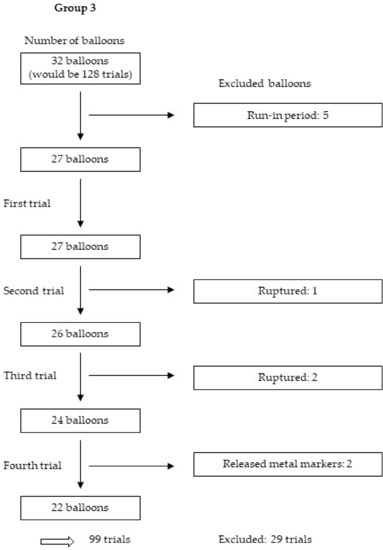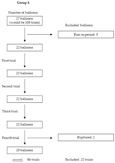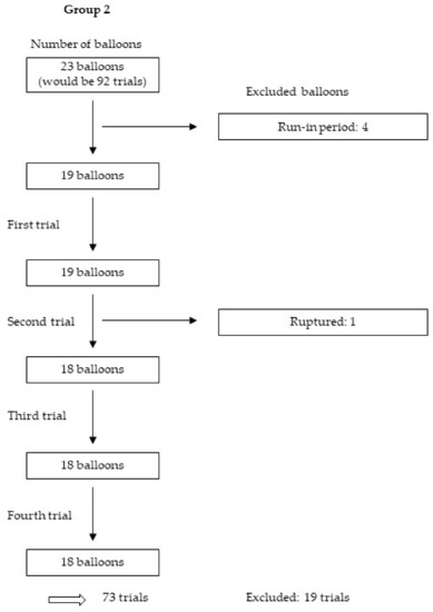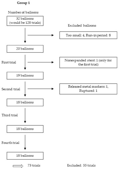 We tested 114 balloons four times each, yielding 456 trials. After the exclusion of 125 trials for various reasons, including those in the run-in period, as well as those with nonexpanded stents, balloons with released metal markers and balloons that were too small or ruptured, we analysed 331 trials from 30 balloons and 58 stents. Figure 5, Figure 6, Figure 7 and Figure 8 show the excluded balloons for each group. The excluded balloons were similar for each group except for group 1, which included the small and short balloons.