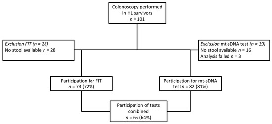 The fecal immunochemical test (FIT) is used for population-based CRC screening in the Netherlands [12,13,14,15,16]. This quantitative FIT detects human hemoglobin in feces and the positivity cut-off can be defined based on test performances. The FIT is easy to use and acceptance among the Dutch general population is high [17,18,19,20]. Participants with a positive stool test are referred for colonoscopy. An alternative stool test is the multi-target stool DNA test (mt-sDNA test, Exact Sciences, Madison, WI, USA). The latter detects, besides the presence of hemoglobin, altered DNA of colorectal neoplasia by sensitive analyses that target specific genetic and epigenetic biomarkers. Mt-sDNA has a higher sensitivity for detecting advanced colorectal neoplasia (AN—defined as AA, ASL, or CRC) compared to FIT [21,22,23,24,25]. FIT is currently considered inadequate for high-risk populations such as Lynch syndrome and individuals with familial risk of CRC, because of a relatively low sensitivity for AN. Therefore, these patients are offered periodic colonoscopy surveillance [26,27,28]. For HL survivors with a known increased risk of developing CRC, the effectiveness of stool tests has not yet been assessed.