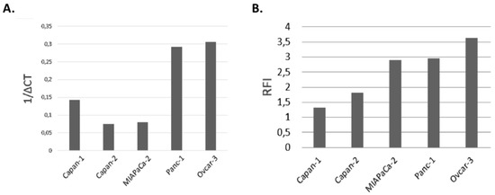 Transcriptomic and protein expression of folate receptor 1 (FOLR1) in pancreatic ductal adenocarcinoma (PDAC) cell lines and one ovarian cancer (positive control). (A) Expression of FOLR1 by RT-qPCR. (B) Membrane protein expression of FOLR1 by flow cytometry (RFI).