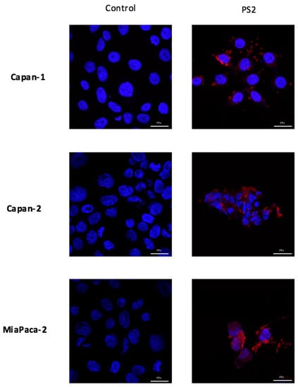Localization of photosensitizer (PS)-2 in four PDAC cell lines. Cells are cultured with 1 µg/mL of PS2 during 24 h. Images are obtained using confocal microcopy 63× magnification.