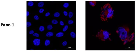 In order to investigate the fixation of PS2 on the four human ADKP cell lines, we incubated them with 1 µg/mL of PS2 for 24 h. We can see that PS2 is mainly located at the plasma membrane level, in particular for the MiaPaCa-2 and Panc-1 cell lines but also at the intracellular level for all the cell lines. In addition, it would appear that lines Panc-1 and MiaPaCa-2 cell lines fix more PS2 than Capan-1 and Capan-2 lines (Figure 2).