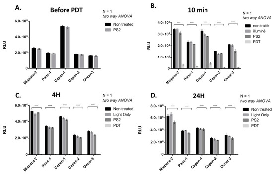 To evaluate the effect of PDT on the four PDAC cell lines, we performed incubation with PS2 at 10 µg/mL during 24 h. Compared to the PS2 condition and light control conditions, the cells subjected to PDT show an important decrease in their viability (95%) starting at 10 min after illumination. The viability 4 and 24 h after PDT treatment for all lines is 0% (Figure 3A–D).