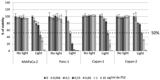 Then, in order to evaluate the tumour secretome we determined a concentration of PS2 that causes 50% decreased of viability (LD50). The LD50 for MiaPaCa-2, Capan-1, and Capan-2 seems to be around 0.66 and 0.166 µg/mL for Panc-1 (Figure 4).