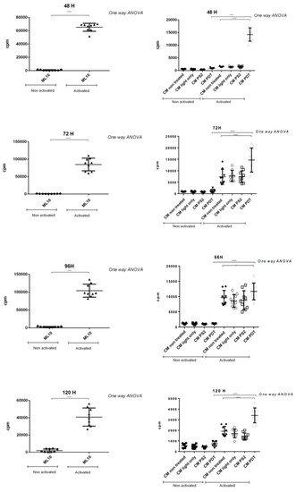 105 PBMCs were cultivated in a ML10 medium made with RPMI 1640 medium supplemented with sodium pyruvate (1 mM), nonessential amino acids MEM 1×, HEPES (25 mM), 2-mercaptoethanol (50 μM), gentamicin (10 μg/mL) (Thermo Fisher Scientific, Waltham, MA, USA), and 10% SVF (GIBCO, Invitrogen). The cells were activated with plated anti-CD3 (1 µg/mL (Miltenyi, Bergisch Gladbach, Germany)) and anti-CD28 (100 ng/mL, (Clinisciences, MontRouge, France). Cancer cell lines supernatant (treated or not) also called conditioned media (50 µL/well) was added to PBMC in 96 round-bottomed plates for 48, 72, 96, 120 h. Proliferation was measured after incorporation of (3H) thymidine (1 µCi/well) (PerkinElmer, Courtaboeuf, France) for 18 h before the end of the culture. Radioactivity was determined using a β-counter (1450 Trilux, Wallac, Finland).