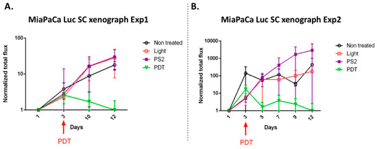 We decided to evaluate the PDT efficacy in a humanized SCID mouse model of PDAC developed in the laboratory. According to the laboratory protocol, SCID mice were xenotransplanted with the human cell line MiapaCa-2 Luc and then subjected to a different treatment. The mice received either PS2 alone, light alone, PS2 and light alone (PDT), and finally one group received nothing. Light alone or PS2 does not seem to affect tumor growth. Very interestingly, we can observe in two independent experiments that the PS2-PDT significantly limited tumor growth in this model (Figure 7A,B).