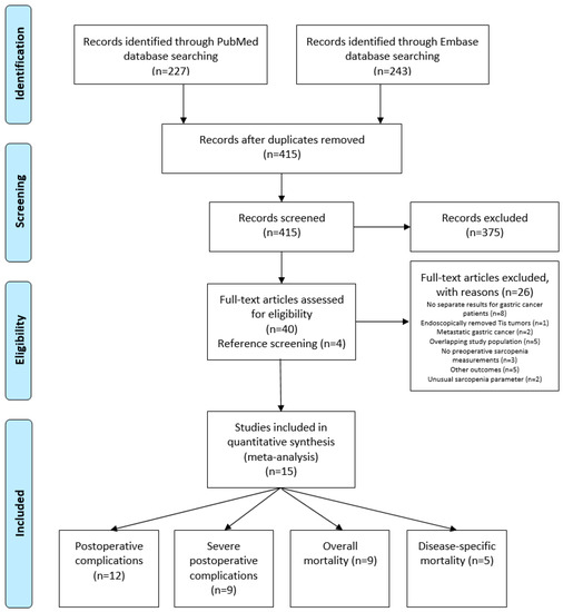After removal of duplicates, a total of 415 studies reporting on low muscle mass as measured on CT scans and gastric cancer were identified. After title and abstract and full text screening, 15 studies were eligible for inclusion, reporting on 4887 patients (Figure 1). The association between low muscle mass and postoperative complications was reported in 12 studies [12,13,23,24,25,26,27,28,29,30,31,32] of which 9 studies reported data on severe postoperative complications (Clavien–Dindo grade ≥III) [12,23,24,25,26,27,28,31,32]. Overall mortality was reported as an outcome measure in 9 studies [24,25,26,28,31,33,34,35], and 5 studies reported on disease-specific mortality [28,31,33,34,35].