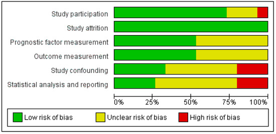 Quality assessment revealed that nine (60%) studies were consecutive cohort studies with low risk of bias regarding study participation [12,23,24,26,27,29,30,32,33,34,35]. Detailed descriptions of prognostic factor measurement [12,23,24,28,30,32,33] and outcome measurement [12,23,27,29,30,31,35] were individually available in 47% of the included studies. Furthermore, only a few studies reported sufficient details on the domains of study confounding (five studies, 33%) [27,31,32,33] to be able to be qualified as having low risk of bias. Only four studies (27%) performed adequate statistical analysis and reporting to be qualified as having low risk of bias in this domain [27,31,32,33] (Figure 2). The majority of the studies (73%) reported results of multivariable analyses, of which the included covariables in the multivariable analyses are included in Table 2 [24,25,26,28,29,30,31,32,33,34,35]. The duration of follow-up varied from 1 to 64 months after surgery [23,30]. The quality of the included studies in general was thus mediocre.
